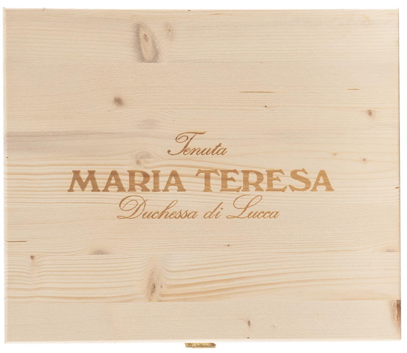 Confezione da 3 bottiglie in scatola di legno marchiata a fuoco con il logo di Tenuta Maria Teresa. Sono disponibili vari assortimenti