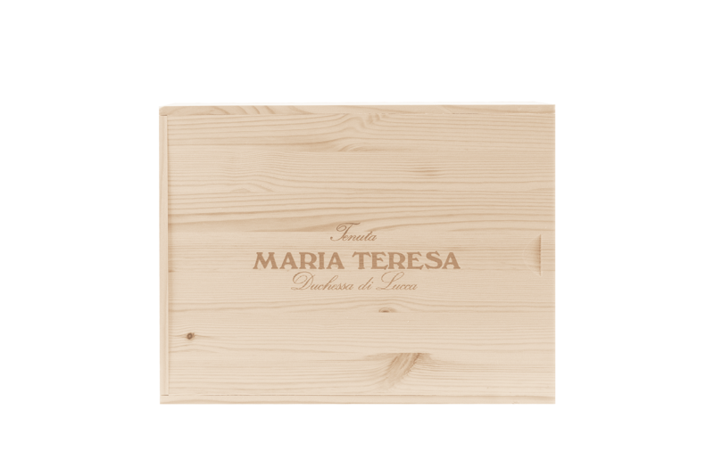 Confezione da 6 bottiglie in scatola di legno marchiata a fuoco con il logo di Tenuta Maria Teresa. Sono disponibili vari assortimenti